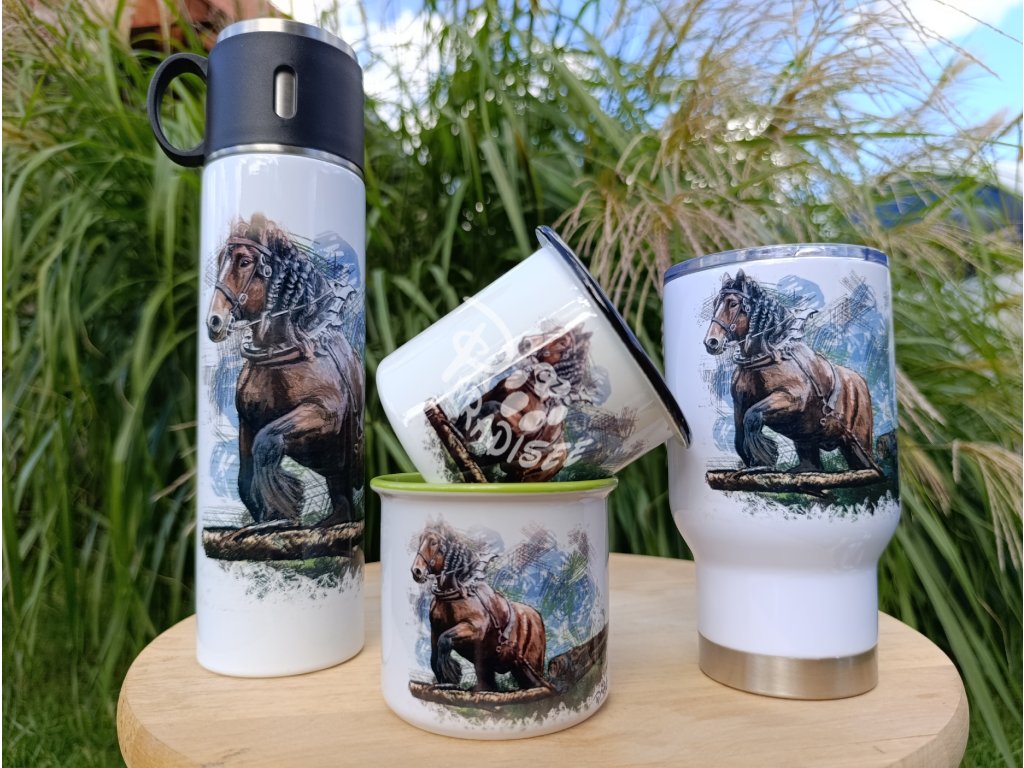 CHLADNOKREVNÝ kůň s kládou - termoska a termohrnek, hrnek - keramický a smaltový, panáková sklenka