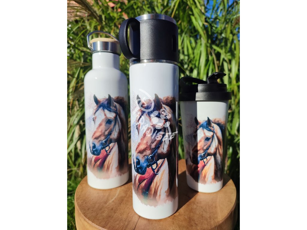 DARCY (kůň) - termoska a termohrnek, hrnek - keramický a smaltový, panáková sklenka
