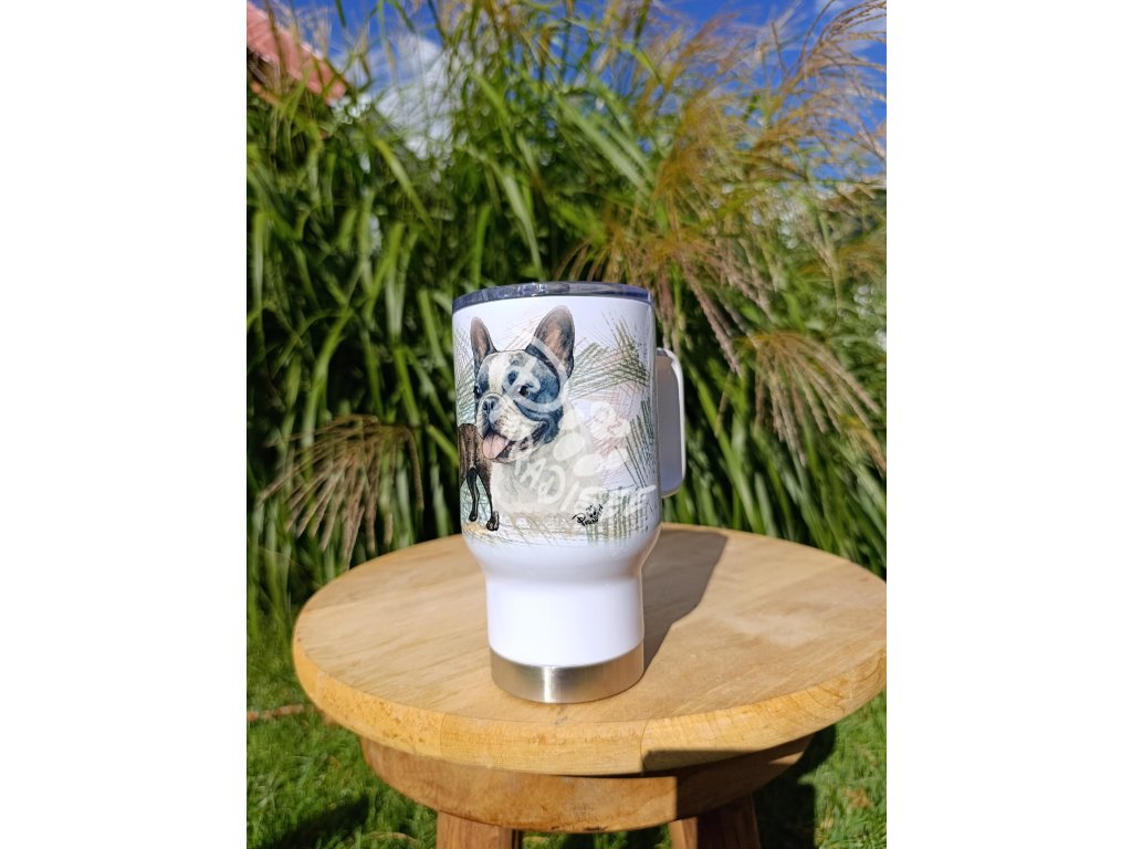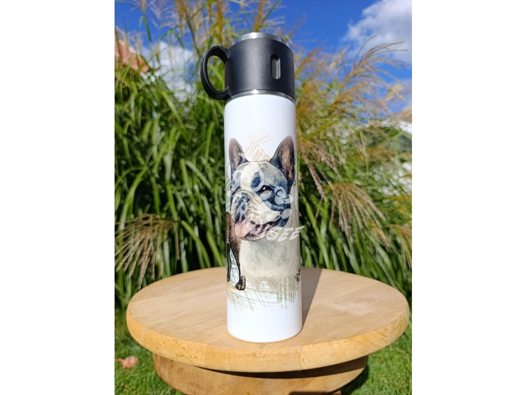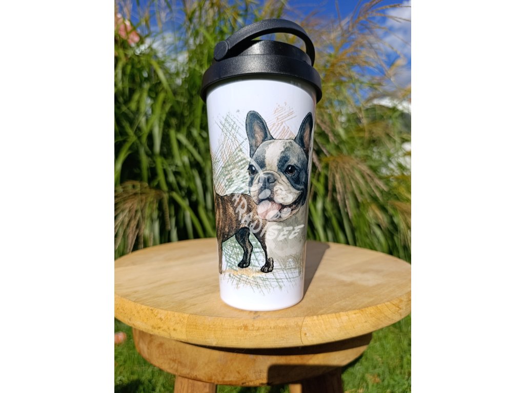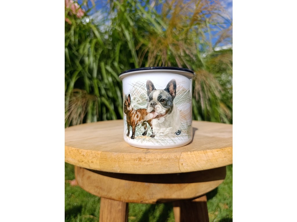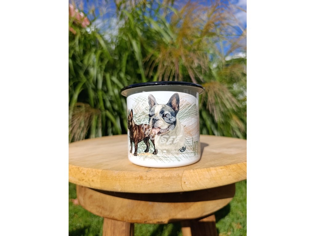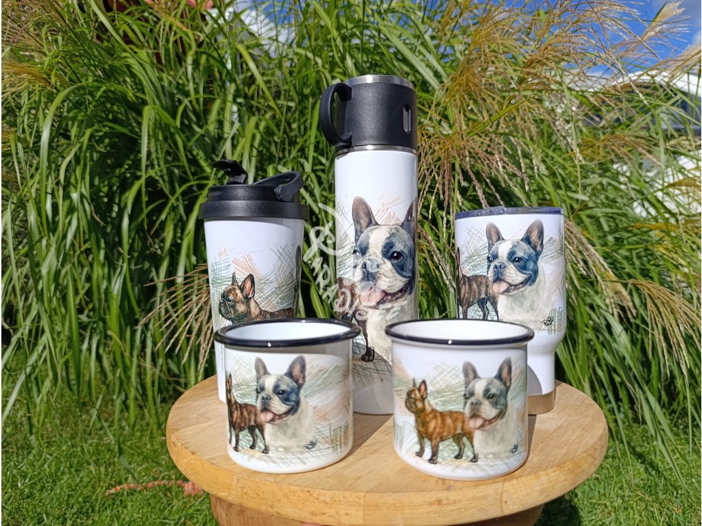 FR. BULDOČEK nový (pes) - termoska a termohrnek, hrnek - keramický a smaltový, panáková sklenka