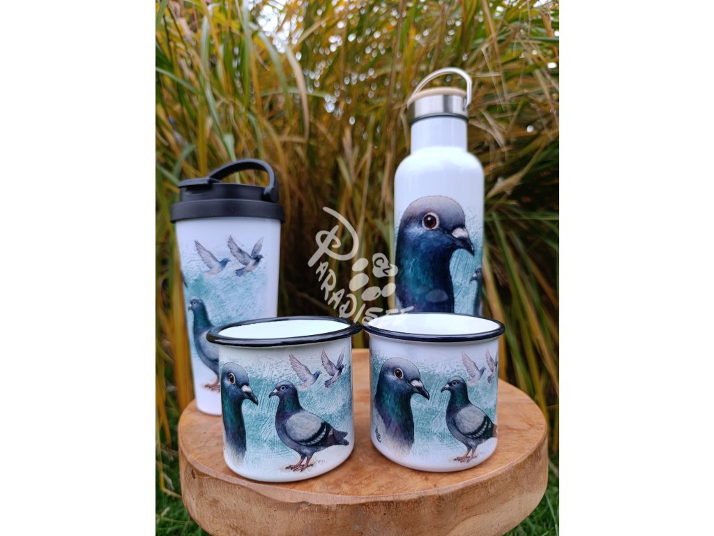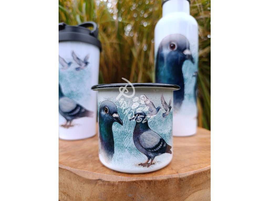 HOLUB poštovní (pták) - termoska a termohrnek, hrnek - keramický a smaltový, panáková sklenka