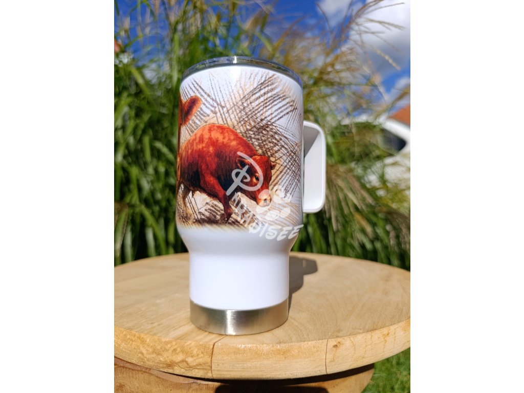 Termohrnek z kvalitního nerezu s ouškem a vyjímatelným plastovým víčkem. Ve víčku je výřez pro napití či prostrčení brčka. Výřez je uzavíratelný posuvným segmentem, čímž se eliminuje možnost náhodného potřísnění při manipulaci s hrnkem např. v autě a současně se ještě zlepšují termické vlastnosti hrnku.
