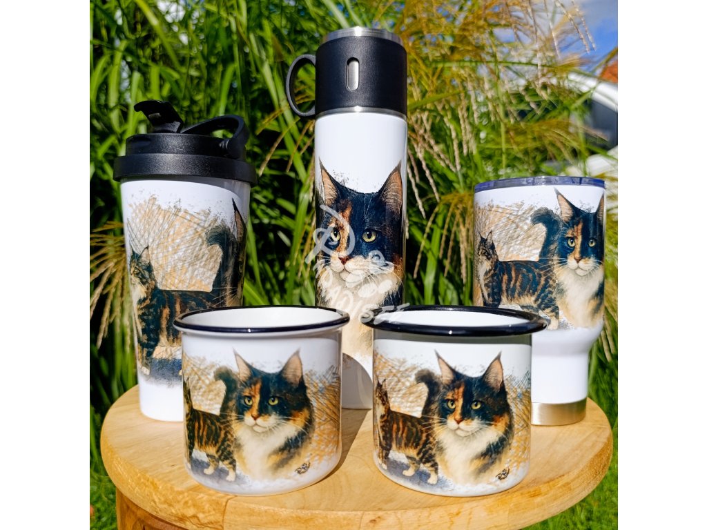 MAINSKÁ MÝVALÍ (kočka)- termoska a termohrnek, hrnek - keramický a smaltový, panáková sklenka
